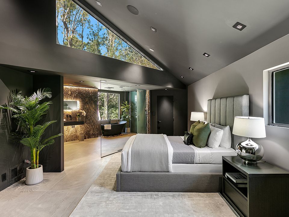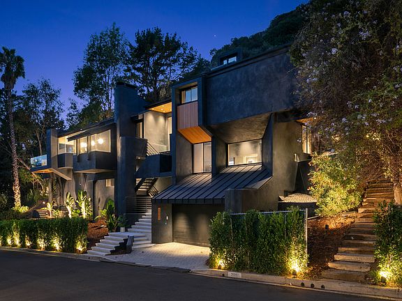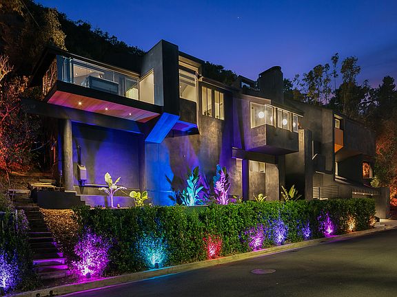 This is NOT Furnished- staged photos! Modern Contemporary Dream Estate in Bel Air: Welcome to the one-of-a-kind Bel Etoile Estate (Bel Air's "Beautiful Star"), recently reimagined, exquisitely contemporary with a reflection of mature dark tones and countless lights and lighting fixtures throughout more than 4,600SF. This architectural masterpiece and entertainer's dream was designed by renowned architect Marshall Lewis AIA. 5 Bed, 4.5 Bath multi-level home w/elevator on a HUGE lot of 38,768SF, rising high above street level, secluded and peaceful with mature trees and custom sustainable landscaping throughout. High ceilings, dramatic large rooms with canyon views, huge living/family room with conversation pit outfitted with custom-fitted fine-grained Italian leather. Fabulous extra-large chef kitchen with natural granite countertops and two large walk-in pantries. High-end materials throughout, including an exquisite, truly one-of-a-kind glistening natural Italian Schist stone in the master bathroom, black leathered stone in the guest wing bathroom, warm Hemlock wood accents and Italian porcelain tile flooring. Fleetwood bi-folding/accordion doors throughout create a seamless indoor/outdoor feel to embrace a truly California lifestyle. Oversized Fleetwood entryway door over 10' in height that opens to custom Italian slab foyer. Showpiece chandeliers are custom made and imported from all around the world. The home has the #1 largest RGB residential smart home lighting installation of its kind in the world, 350+ lights both inside/out can be set to any desired color to suit your every mood and circadian rhythm. Full-home in-ceiling and backyard Sonos speakers. Wine cellar, bar and laundry room with oversized commercial-grade sink. Home gym equipped with built-in Tonal and preferred equipment for CrossFit athletes. 2-car garage with ample storage space and street parking.