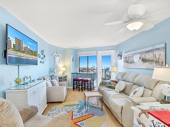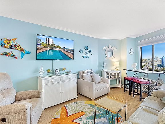 Fabulous and Furnished well appointed ocean view condo. ELEVATORS for the top floor.  International airport close plus Market Common shopping area. Bluewater Resort Hi-Rise offers onsite restaurant plus  exercise room.  Condo on top floor Fifteenth and is First unit after departing designated elevators.  Ocean View from balcony. Kitchen range is glass top with built-in microwave, plus Refrigerator/ice maker;  storage is abundant in condo with custom made additions complimenting the style in condo.  Indoor pool, spa, outdoor pools and the Ocean to enjoy. Security of building with codes to enter and security on site.  Detail in condo; Floors are ceramic; PVC crown moulding with ceiling fan. Beautiful sunrise off the balcony and sunsets from the front door. Relax in dual power sofa, power recliner, since sleeper chair and 50 inch bedroom tv plus 55 inch tv living room. Shades are electric plus Blackouts. Note: onsite restaurant for convenience. Downstairs lounge nicely decorated and relaxing. Come view this Condo!
