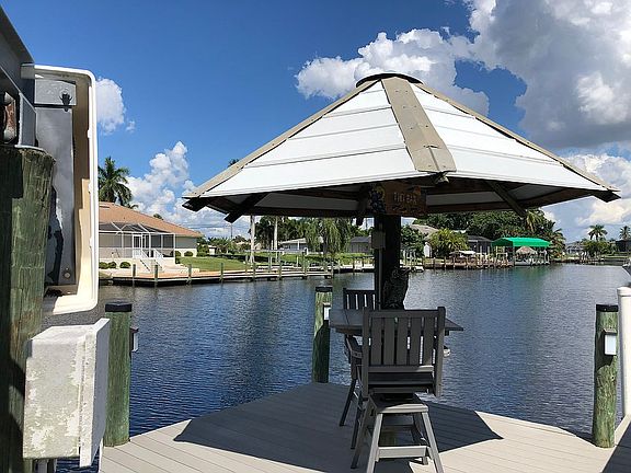 FOR SALE BY OWNER This home is your Boaters Dream located in the beautiful Savona Neighborhood just five minutes direct Gulf access between the two bridges close to downtown Cape Coral. Spacious 2,288 square foot Single family home with 3 bedrooms, 2 1/2 bathrooms, Den which could be alternate master bedroom and Double Car garage. French Doors and Sliding Glass Doors open up to the very spacious screened Lanai with brick pavers and Limelight Glow 4 Adult Hot Spring Spa, Easy Lift, and Steps with Integrated MP3 Sound System. The 140 foot canal is accompanied by many beautiful sunsets. Pavers on cantilever dock with composite captains walk to full width of property, spacious composite deck along with two 10,000 pound boat lifts and tiki hut, Full Paver driveway, front porch entryway, back porch and walkway from front to back of property. There are two storage buildings inside the fenced backyard including special pet fence area out one lanai door. There is mature landscaping nicely maintained and automated sprinkler system on Cape Coral dual water. Fiber optic internet installed. The home has been totally remodeled inside and out during residency including kitchen, bedrooms, bathrooms, all flooring, all inside and outside doors, garage door, updated windows, new main service fuse box, new plumbing, security system, extensive double blown in attic insulation and ductwork. There is crown molding in Living Room, Dining, Kitchen, Half Bath and Master Bedroom. The Spacious Master Bedroom has two closets and bamboo hardwood flooring. There is a beautiful Master Bedroom Bathroom with Double Sinks, Granite Countertop, large shower and modern freestanding bathtub. All floors are tile throughout except for master bedroom. Kitchen has stainless steel appliances and a pantry. Cabinets include new wood doors, glass doors and granite countertops and backsplash. Home has newer 4 ton 15 seer air conditioner, separate Air conditioning systems each for master bedroom, den and garage. Home includes a automatic Whole Home Generac 22500 KW Generator with in ground 500 gallon propane tank and hurricane accordion shutters. All assessments paid, central water, sewer and irrigation.