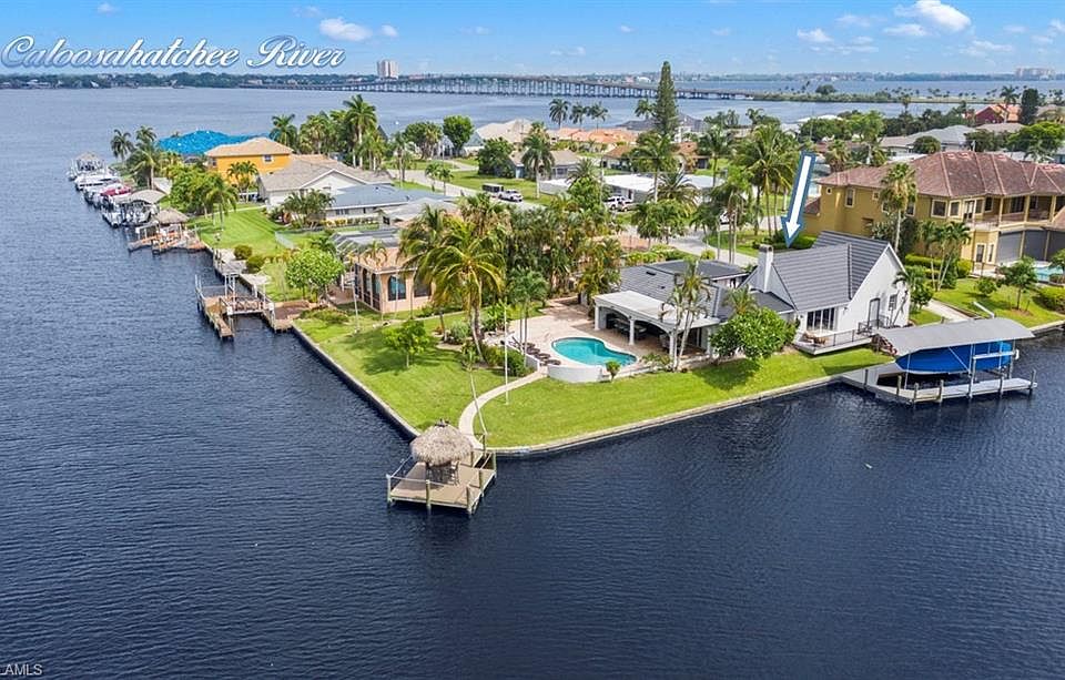 Upgraded Gulf-access riverfront home on a RARELY AVAILABLE 3-corner lot situated at the end of a cul-de-sac with incredible 280+ feet of water frontage! Enjoy quick Gulf access in deep waters (no bridges) from wraparound boat dock & 13K boat lift with an additional private boat launch. This retreat boasts stylish tray & coffer ceiling accents, spacious bedrooms & stunning water views from nearly every room. Kitchen is outfitted with all stainless-steel appliances, eat in breakfast bar, ample counter space, plenty of cabinetry & adjacent dining area. Massive entertainment deck boasts panoramic water views, heated pool, outdoor kitchen & ample lounging areas plus a floating dock with tiki hut, prime for nightly sunset gazing. Upgrades include whole home interior & exterior paint, new dock, new boat canopy. Bonus flex space above garage could be converted to additional living area. PERFECT rental investment with no HOA or rental restrictions. With an unmatched view & ideal location, this home is a must-see!