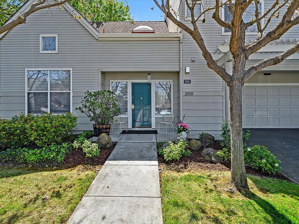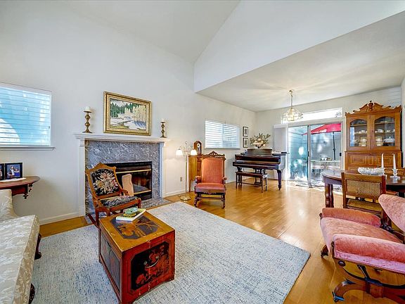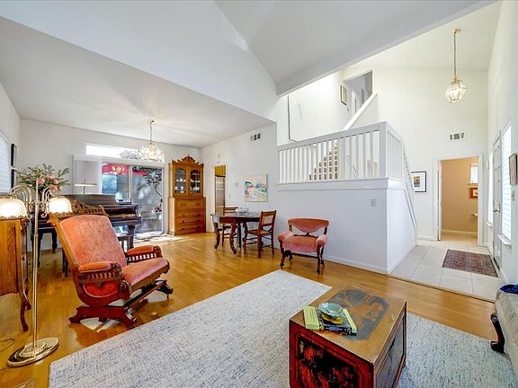 Dramatic two story condominium lives like a duplex - featuring high ceilings, a fireplace in the living room, breakfast nook in the kitchen, a separate family room on the second level, a large yard, and attached 2-car garage. Well planned kitchen has cozy breakfast nook seating, granite counters, generous storage, including a double door pantry. The main level of the home has oak and tiled floors and easy access to the patio and wide yard which is bordered by roses and other blooming plants. Second level includes a cheerful family room with high ceilings - central to the 3 bedrooms - all generous size. Primary bedroom has high ceilings, built in cabinetry, walk-in closet, wide vanity and bathing area with separate tub and shower.