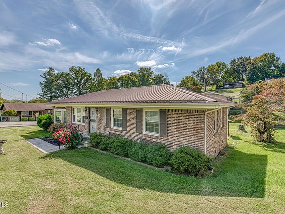 This has a metal roof, good solid heat pump with central air/heat, a 2 car garage, updated kitchen, nice hardwood floors, an outbuilding, nice mature pretty flowers, a separate den and dining room.