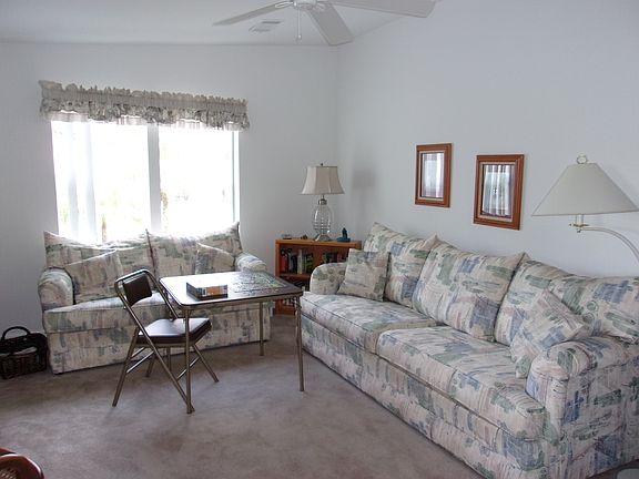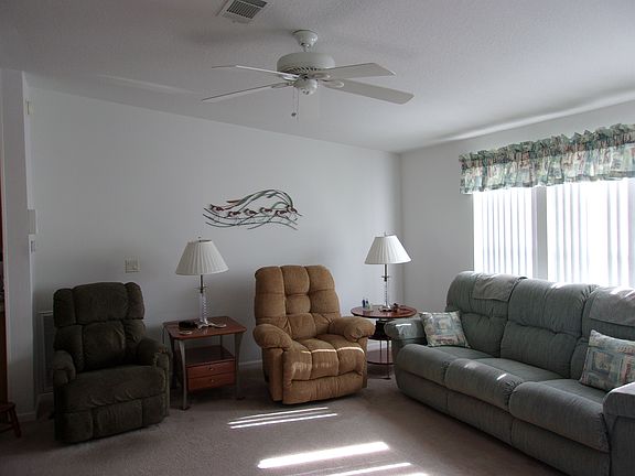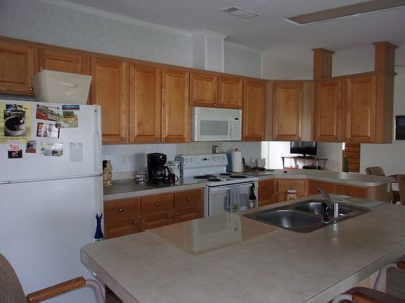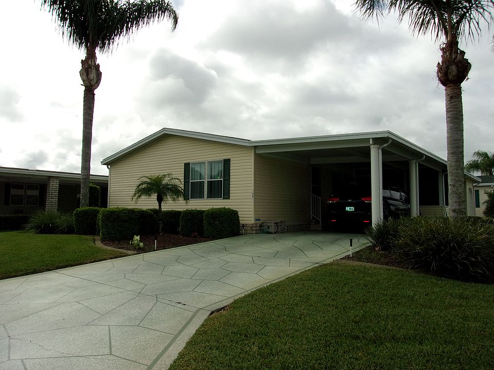 3 BR 2 BA 1568 SQ FT home. This great open, split floor plan offers a beautiful corner lot. Partially furnished home, large screened in lanai, large kitchen for entertaining, large covered carport, golf cart garage, painted driveway, beautifully landscaped, large master suite with double sinks in the bathroom, immaculately kept and beautifully decorated, New laminate flooring, New AC in 2012, new Roof In 2017.