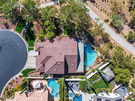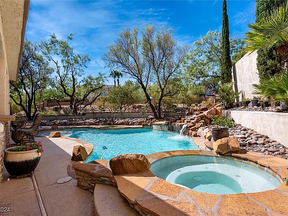Looking for a backyard oasis? This incredible 3-bedroom plus den home located in the guard-gated community of Country Rose Estates in North Summerlin. This beautifully designed property offers 2,628 square feet of living space on an expansive 10,000+ square foot lot, end of culdesac, providing ample room for both indoor and outdoor enjoyment. Step outside to your private oasis featuring a newly plastered pool and spa, perfect for relaxation, along with an outdoor kitchen for entertaining. The backyard is a peaceful retreat that backs onto a serene walking path, giving you added privacy and a connection to nature. The spacious primary suite is conveniently located on the main floor! The home boasts a newer roof and updated landscaping, ensuring a low-maintenance, move-in-ready experience.