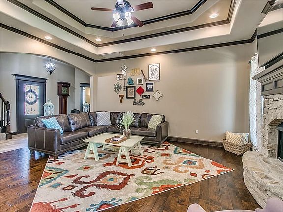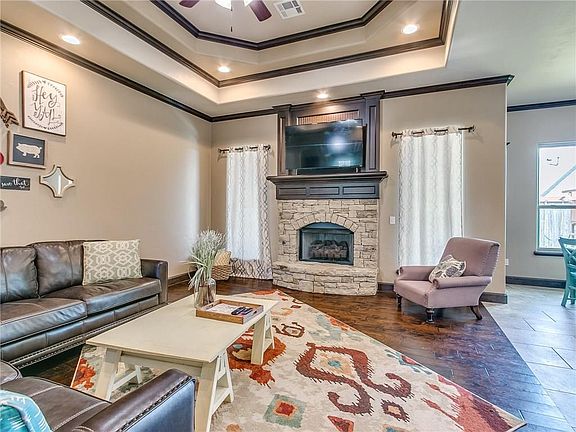 BEAUTIFUL HOME in POPULAR Prairie West. Flexible floor plan w/ 3 or 4 bedrooms, office w/ closet (4th Bedroom option), 2.5 bath, Bonus Room (2nd Living), Mud Bench, Walkin Pantry, Iron Railed Staircase, Wood floors in Office/4Bedroom & Living Room. High ceilings w/ crown molding & extra LED lighting through-out. Gourmet Kitchen w/ stressed white custom cabinets, granite counters, HUGE 75inX61in kitchen island & custom cabinet pullouts. Open floor plan offering you many hours of great entertaining while sitting around the beautiful stone gas log fireplace. Bonus room offers a half bath, closet & walkin access to attic & its own HVAC unit. Master Bed offers a HUGE walkin Closet with 3 level hanging rods, built-in chest of drawers & shelving, tiled shower, sep tub & dbl vanity. Covered patio w/ gas hook up for your grill, children's play-set, privacy wood fence, irrigation system & garage floor storm shelter. Don't miss out on this 1 Owner home, custom built by JP Homes. Its a must see..