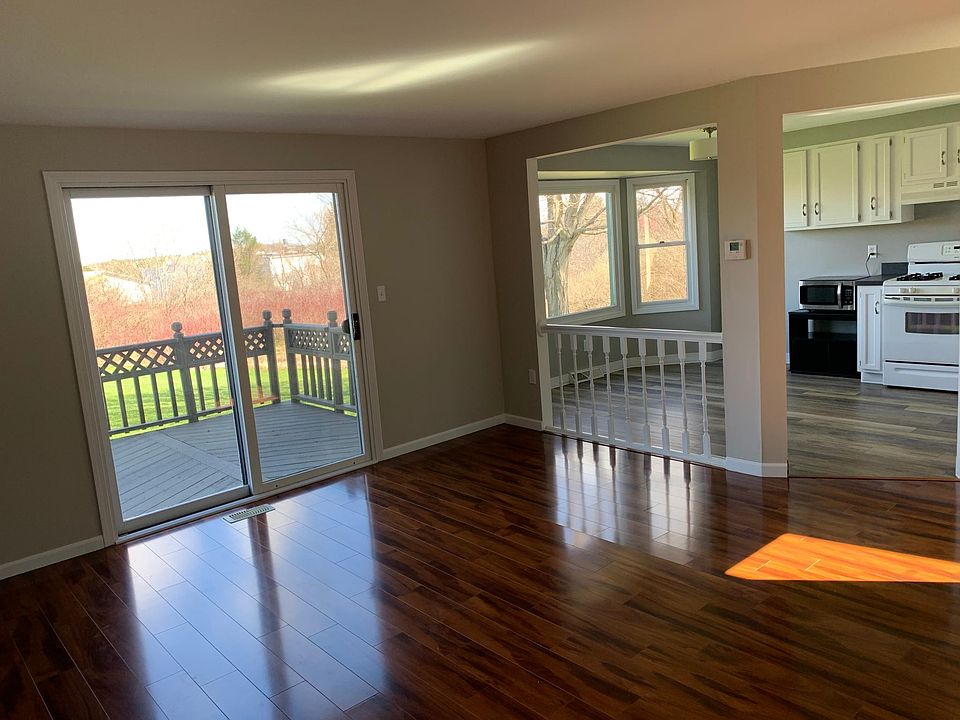 Newly updated two bedroom 1.5 bath duplex for rent in Elma, 1.5 miles north of East Aurora, with central air conditioning. Open concept first floor with sliding doors leading out to a private deck overlooking a large backyard with no rear neighbors. Upstairs is a large master bedroom with high ceilings, a second bedroom, and full bathroom. Includes a refrigerator, stove, washer and dryer. Includes yard maintenance, and snow removal. Tenant pays gas and electric, landlord pays water. $1200 per month. 1 year lease required with references, background check, and 1 month rent security deposit. Available February 1st. Owner pays water.