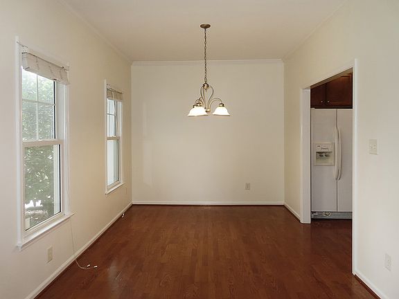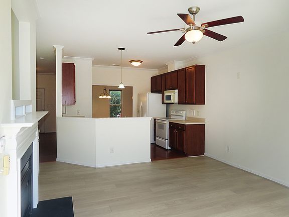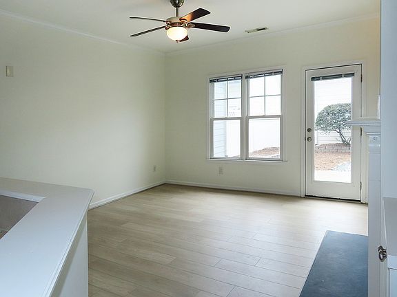 Located in Governor's Village, this two-story townhome offers comfort, convenience, and access the community amenities including a pool, tennis courts, playgrounds, walking trails, and nearby shops all just minutes from Jordan Lake. A covered front porch leads into a welcoming entry that opens to a combined dining and foyer area. The main floor flows naturally from the dining space through the kitchen and into the living room at the rear of the home. There are hardwood floors in the dining area and kitchen. The living room has wood-look plank flooring. The living room features built-in bookshelves, a gas log fireplace, and a ceiling fan. The kitchen includes a pantry and appliances. The kitchen is open to the living space, creating a comfortable layout for daily living. There is an exit from the living room to the patio and courtyard leading to the garage behind the home. A half bathroom and under-stair storage complete the first floor. The bedrooms are on the second level, both with carpet, ceiling fans, and private bathrooms. The primary bedroom, located at the back of the home. The bathroom for this bedroom includes a walk-in closet, a dual-sink vanity, and a separate tub and shower. The second bedroom is detailed with a chair. This bedroom has a double-door closet. The bathroom has a tub-shower combo and linen closet. A laundry closet with washer and dryer is located upstairs, along with an additional linen closet in the hallway. A privacy fence surrounds the courtyard. There is a storage closet on the patio. The one car garage is accessed by the street alley behind the home. There are built-in storage cabinets in the garage. Street parking is also available in front of the townhouse. Pet with fee and prior approval.