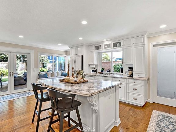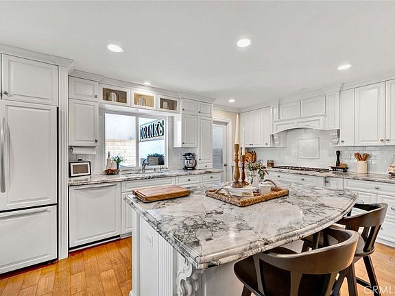This beautifully upgraded home features three bedrooms, three bathrooms, and a dedicated office space, ideally located at the end of a cul-de-sac with RV access. Situated within the highly desirable Moffett, Sowers, and Fountain Valley High School boundaries, the property offers excellent curb appeal with charming brick accents and a bay window. The gourmet kitchen includes a Thermador cooktop, counter-depth refrigerator, custom-built cabinetry, real stone countertops, and a spacious walk-in pantry. The primary suite has been expanded and showcases an extra-large walk-in closet and a stunning spa-inspired bathroom with a soaking tub, walk-in shower, and vanity. The backyard is designed for entertaining with a built-in BBQ, patio cover equipped with heaters for year-round enjoyment, and multiple serving bar areas ideal for gatherings. Additional features include real wood flooring throughout, plantation shutters, a newer roof, upgraded electrical panel, central air conditioning, a three-car garage, and an upstairs laundry room. Located less than two miles from the beach, this home offers an exceptional combination of coastal living, modern upgrades, and an ideal location in one of Huntington Beach’s most sought-after neighborhoods.