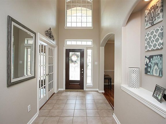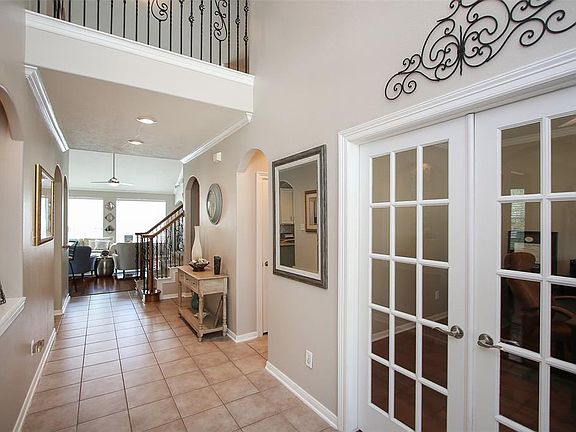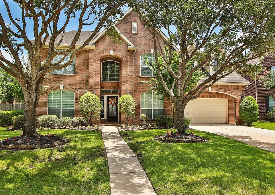TOUCH OF EXCELLENCE w/Backyard Paradise! 4 bedrooms, 3.1 baths Enter into 2 sty entry w/bevel glass front door opening to Formal Dining w/wood floor and Study w/double French doors and wood floor. Kitchen w/gourmet style island, SS appliances, 5 burner gas cooktop, double ovens, one gas and one electric, solid surface counters, custom back splash, lazy susan cabinet, and walk-in pantry. Den w/tall ceiling, gas log fireplace, wood floor and fabulous view of backyard w/sparkling Pool and Spa plus cascading waterfall. Master bedrm dn w/wood floor w/adjoining luxury bath. Granite vanities, large frameless shower, plus large walk in custom organized closet. Game room up w/pool/ping pong table, built in bar w/refrigerator, Kegerator w/2 taps. Covered patio, double pane windows, sprinklers, house backs to greenbelt with park like setting.