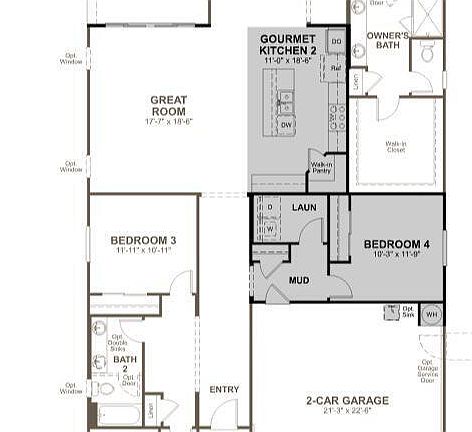 The ranch-style Augusta offers thoughtfully designed living space with a range of personalization possibilities. The foyer leads to an open floor plan with a kitchen, a great room, a dining room and a covered patio. Looking for extra space for entertaining? Add a club room and an extended covered patio! You'll find a spacious owner's suite next to the dining room, showcasing a walk-in closet and an attached bath that can be personalized with three deluxe options. This plan also offers two bedrooms and a bath; for more space, choose another bedroom in lieu of garage storage. Additional options include gourmet features in the kitchen, alternate kitchen layout, a corner-meet door in the great room, multi slide and center meet door options and a study instead of third bathroom.