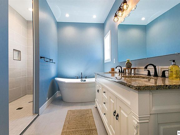 Beautiful Walkout Ranch in Timber Hyrst subdivision features an open floor plan, 11' main level ceilings, white maple cabinets with quartz countertops, stainless steel appliances, subway tile backsplash, gas fireplace w/ stone surround, master walk in shower, & soak tub, granite master vanity top, front office or formal dining area w/ french doors, finished lower level, three seasons room w/ attached walnut composite deck, step-less entry, main floor laundry & more.