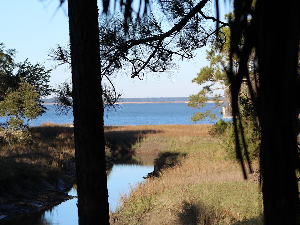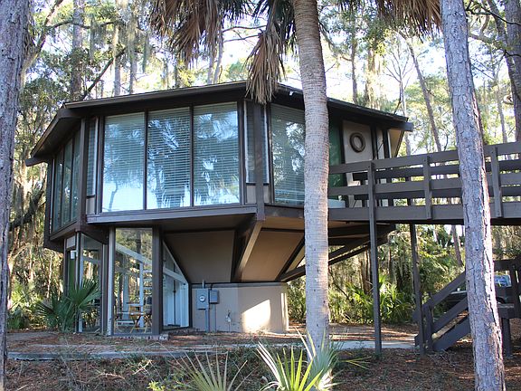 Unique, elevated octagonal house with views from all rooms, nestled in the woods on a tidal creek. It is fully furnished and ready for you to go on vacation. Neighborhood Description 75 of these octagonal homes are located on Deer Island, a nature preserve. Each one has unique placement for privacy and views. 2002 has one of the best locations, as you are just steps from Harbourtown, yet in a serene location overlooking a tidal creek and the Sound.