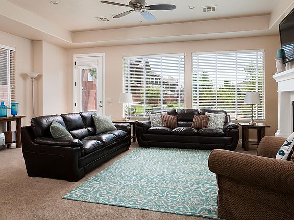 Approved nightly rental with flowing open floorplan. This darling end unit comes complete with popular white kitchen cabinets and plenty of upgrades including a beautiful fireplace. Enjoy one of two private patios with a rare grassy area in the back. Community features 2 heated pools, clubhouse, putting green, playground, and a stocked fishing pond.