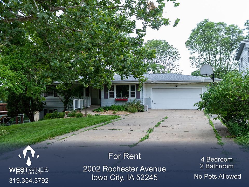 This 4 Bedroom, 2 Bathroom House is available for 8/1/25 Move-In! Copy this link to your browser to schedule a showing at your convenience. 4 Bedroom, 2 Bathroom single family home located in Iowa City. This house is a great property for those with a green thumb as both front and back yards offer plenty of garden space. Hardwood flooring in the Living room. 3 bedrooms and shared bath on main level. The kitchen features a dishwasher and ample cabinet space. Deck and Patio! In-unit washer and dryer. Finished basement which includes a bedroom with en suite bathroom. Attached 2 car garage included. Included in Rent * 2 Car Garage (Attached) + Additional off-street parking Not Included - Tenant Responsibilities - Electricity & Gas: MidAmerican - Water: City of Iowa City - Garbage - Snow Removal: Bring Your Own Shovel! - Lawn Care: Bring Your Own Mower! Additional Disclaimers *Photos/Floor Plans May be of a similar unit *No Pets allowed Please visit our website for additional rental properties, application details, schedule showings, and more!
