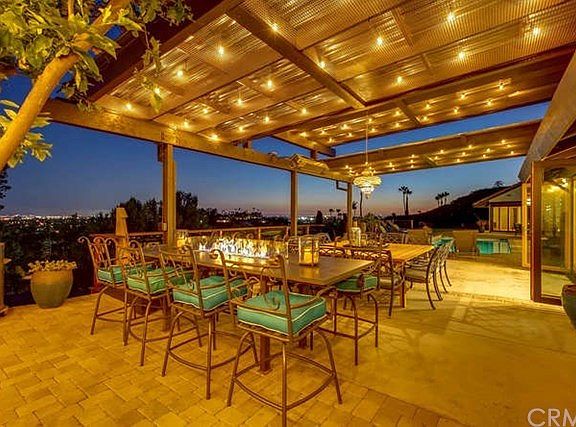 The ultimate private resort - this luxurious North Tustin property has it all: panoramic views, a single level house with soaring ceilings, pool/spa, lawn, patio, outdoor kitchen, a three-car garage and RV parking. Enjoy epic winter sunsets silhouetting the towering palms that crown Red Hill as a fiery orange and red glow blazes over the hilltop. Or start the morning with a sunrise soak in the hot tub as the sun paints the sky in an ever-changing palette of vibrant color and a chorus of songbirds welcome the new day. A bi-folding door system opens the entire living room to the pool deck, where a backdrop of rolling hills, majestic trees and city lights creates a canvas of the natural world. Parties are a breeze with the gorgeous chef's kitchen, featuring striking solid-glass counter tops, contemporary wood grain cabinets, and professional grade appliances, all laid out for entertaining and open to the ultimate great room. Host an evening cocktail party under the heated covered patio and serve up gourmet food and drinks at the custom outdoor kitchen which includes a kegerator, cocktail center, dishwasher, side burners, grill, a pizza oven, and a bar table with fireglass insert. Custom built glass-paneled decks are perfect for enjoying the view or just enjoying a lazy day by the pool. Other features include dual pane windows, LED lighting, dual HVAC systems, an enclosed pet run, an orchard with 30 fruit trees, veggie garden, built-in garage cabinets and attic sto