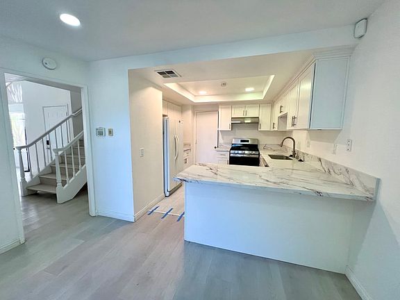 Beautifully remodeled two-story home in a prime Anaheim neighborhood near Disneyland. New bathrooms, kitchen, it boasts luxurious upgrades and a spacious floor plan for modern, comfortable living. The gourmet kitchen is a chef's dream, showcasing a large island, quartz countertops, a stylish subway tile backsplash, a farmhouse sink, stainless steel appliances, and custom cabinetry. The cozy living room includes a fireplace, and laminte wood flooring throughout. Spacious master bedroom comes with a large walk-in closet. The master bathroom offers a relaxing retreat with a walk-in shower and a double sink vanity. Step outside to a generous backyard, perfect for entertaining or soaking up the California sun. Community also offers swimming pool for you to enjoy. Conveniently located near shopping, dining, parks, and schools, this home also provides easy access to the 5, 57, and 91 freeways. You're just a short distance from the Anaheim Packing District and only minutes from Disneyland—the happiest place on Earth! Don't miss out on this stunning, move-in-ready home. Owner pays for HOA, including water and trash. No dogs, no smoking.