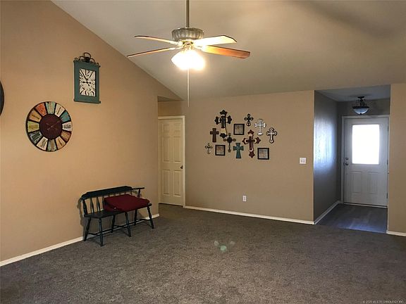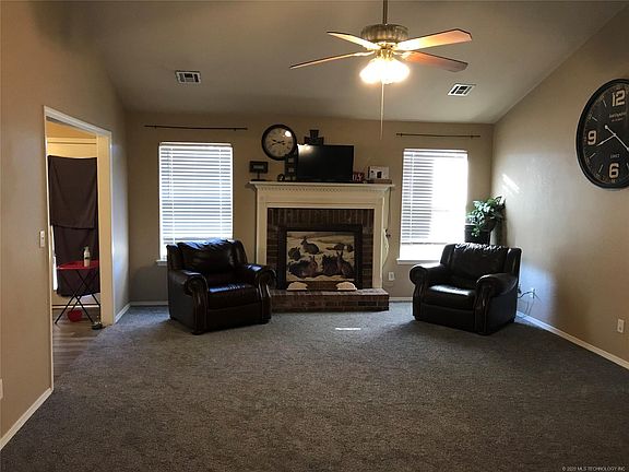 Country living just on the edge of Claremore, nice looking 4 bedroom, 2 1/2 bath with fresh indoor paint & floor coverings. Additional updates makes this a real find and includes a really nice covered patio facing west. Vaulted living room ceiling with a wood burning fireplace.