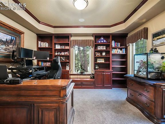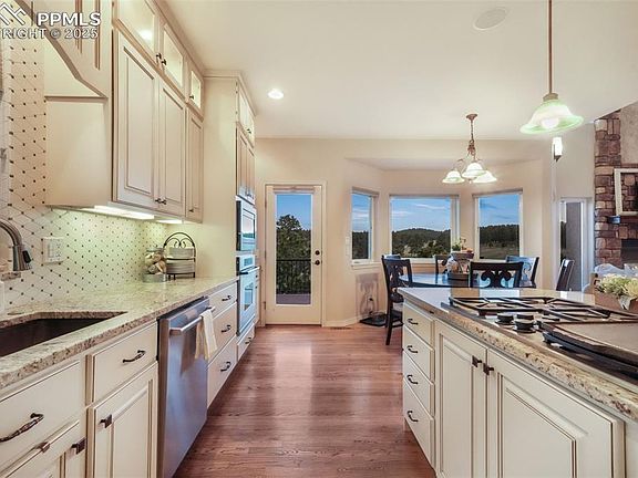 Welcome to your Colorado dream estate nestled in the prestigious Wissler Ranch—where luxurious living meets natural tranquility. Situated on nearly 5 acres of mature pines, this home is a true entertainer’s dream with an updated gourmet kitchen, expansive composite deck, and an outdoor kitchen featuring an authentic Fogazzo pizza oven, sunken fire pit, and putting green. This exceptional 5-bedroom, 5-bath custom home is designed for refined living and effortless entertaining. Inside, you'll find a two-story great room with a grand fireplace, a formal dining room perfect for elegant gatherings, and a finished walkout basement complete with a walk-in wine cellar, wet bar, steam shower, and media area. The luxurious primary suite boasts a 3-sided fireplace, sitting area, 5-Piece bath with spa-inspired bath, and an adjoining bonus room. Upstairs includes a junior suite and jack-and-jill bedrooms. Additional highlights include a private office with French doors, laundry chute, and 2020 upgrades include the Gourmet kitchen, composite deck, electrical panel, water softner, and main living area.Additional Features include: Oversized 3 car garage and 24 ft. stream water feature. Don’t miss your chance to own a piece of Colorado paradise.