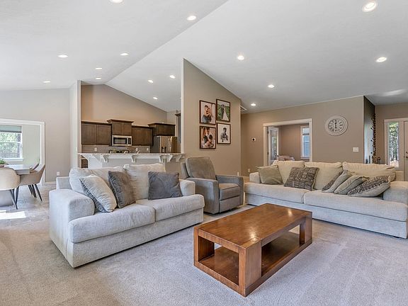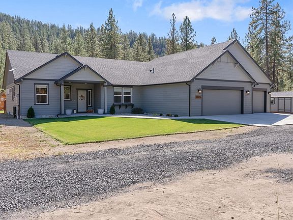 Nestled on over 10 acres, this 4-bedroom, 2.5-bath rancher offers the perfect blend of comfort and space! Vaulted ceilings & large windows flood the home with natural light, while the open-concept kitchen, dining, and living area creates an ideal space for entertaining. A versatile office or playroom adds extra functionality. The primary suite features a serene ensuite bath & an oversized walk-in closet, while two additional bedrooms are tucked away on the opposite side for added privacy. Outside, you'll find a spacious yard with a garden, shed, powered chicken coop, and a charming gazebo with a patio for outdoor relaxation. There's ample space and power for a future shop—perfect for hobbies or extra storage. The home is equipped with a heat pump, AC, and a strong well delivering over 27 GPM. Riverside State Park, with its access to the Spokane River and hiking trails, is just down the road. This beautiful Nine Mile home offers peaceful living with easy access to outdoor recreation!