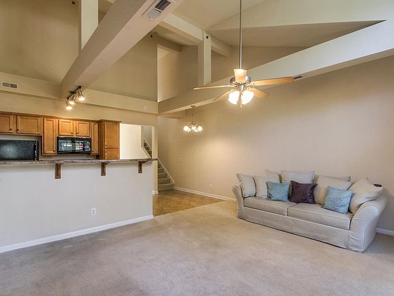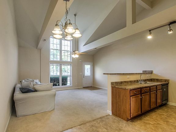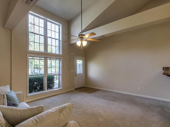 Charming townhouse near the heart of Spring Hill Open layout with cathedral ceilings, ceiling fans in bedrooms, Large cabinet pantry in the kitchen, refrigerator, washer, and dryer remain. Carpet is worn in the front bedroom.
