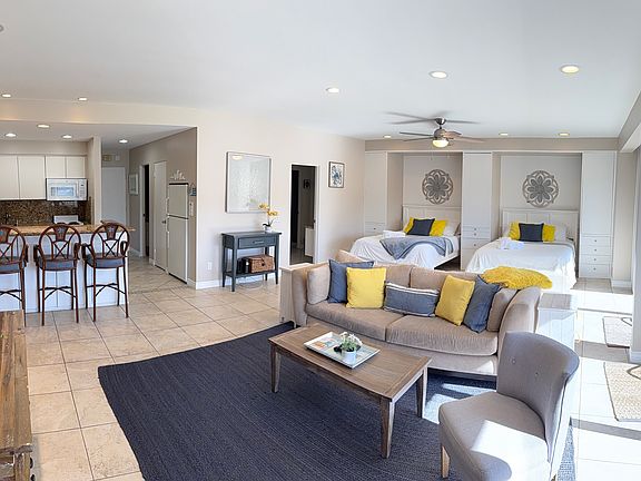 Fantastic fully furnished studio condo on the grounds of the Omni La Costa Resort & Spa!! Live the resort lifestyle of La Costa! Walk to the amenities of the beautiful resort which boasts two championship golf courses, tennis, The Spa, top rated restaurants, shopping and more! Easy drive to beaches, shopping and entertainment. Just minutes to the ocean! Watch La Costa tennis from your own private balcony! Large studio, 791 square feet, fully air conditioned. Beautifully tiled floors, granite in kitchen, great view balcony with table and chairs! Just remodeled!! 2 NEW queen beds + large living room with couch & lounge chair + bar top with 3 bar stools. Plenty of closet space including large walk in closet, mirrored door regular closet, and built in drawers in dressing area! Wonderful community pool and barbecue area. Secured underground parking. Dedicated underground parking space. Close to the beach and entertainment. Single level on second floor. Elevator to home. Available now! Owner pays water, trash, and sewer