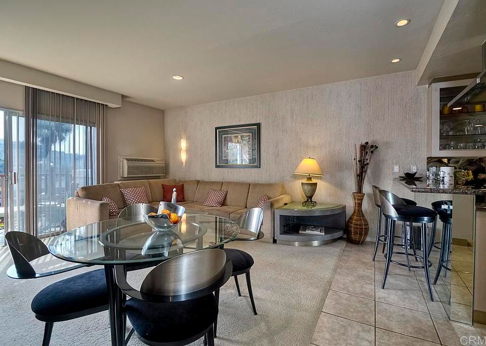 Upgraded a several years ago-This Furnished 1 BR condo is located in a building on the main entry drive of Omni La Costa Resort. Fully Furnished desirable 3rd floor unit that overlooks tennis courts and pool from top floor balcony. Building has an elevator and two stairwells. Enjoy Affordable Resort Living or Short Term Rental opportunity. Built-in bookcases with storage divides living room to a separate bedroom. The bath has a make-up vanity, walk-in closet and a tub/shower. There is full size laundry room inside the unit with a sink, storage cabinets and stacked washer-dryer unit for your convenience. Full size kitchen with bar. Coded security entrance to building and community garage with 1 assigned space is located in the underground garage that comes with the unit. In addition, the garage contains a public coin laundry room with additional common laundry facilities located there. This condo faces south so it is light and bright. Enjoy the beautiful days on your balcony overlooking the common area pool and tennis courts of the resort. Approved for short term rentals.