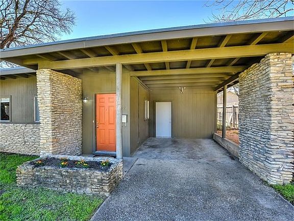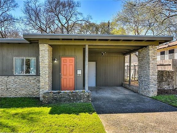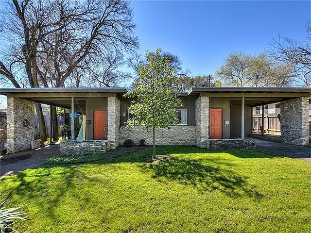 Zilker area Mid-Century style! Rare native river rock, horizontal lines. Live in one side, rent the other. Side 1, updated kitchen, hardwood floors, full-size carport, W/D in carport storage. Side 2 has updated kitchen, utility/storage room & covered patio. Both sides have a fenced back yard. Open floor plans, large kitchens with dining peninsula, bright living areas, good storage. Easy walk to Little Zilker Park and Zilker Elementary, SoLa restaurants & shopping. Barton Springs Pool, hike & bike nearby