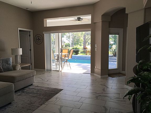 Phone or text 321 662 4178 A lovely fully renovated open concept home with modern granite kitchen and bath tops. All new stainless steel kitchen appliances, flooring and bath tile. Three bedroom, two bath home with a pool and fabulous golf course view. Access to the pool area is available from the master bedroom, family room and the guest bedrooms. 4 year old roof, lanai re-screened 1 year ago. The master bedroom has both a Jacuzzi corner tub and a free standing glass walk-in shower, double sinks in vanity joining onto a walk-in closet. Spacious 2 car garage. All Appliances convey including new Washer and Dryer. Located in Spruce Creek Fly-In, this home has a wonderful location near shopping, schools and interstate highways. The community is a gated golf-course community with 24/7 security staff. Club membership is optional. Various levels of membership are available. The club features golf, tennis, swimming, exercise, plus a private restaurant.