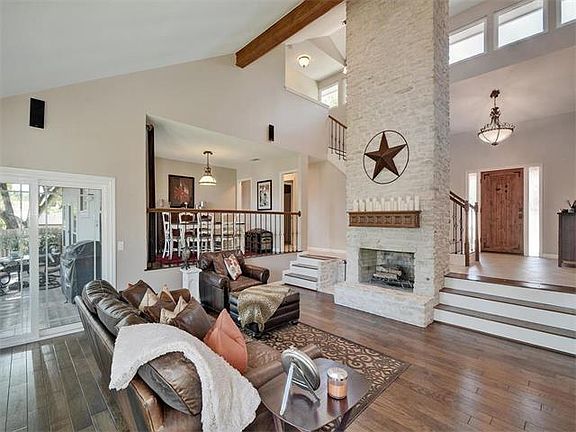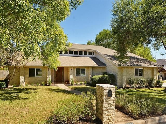 In acclaimed Eanes ISD. Corner lot. 3 bedrooms down, master upstairs with private balcony attached. Master bath well appointed with separate tub and shower with 6 heads (in the toilet room). Spacious walk in closet provides all the storage you need. Travertine tile and scraped wood floors in common areas and master. Cool "game day" room off of kitchen great for entertaining. Grand floor to ceiling 360 degree fireplace. 1 year old triple pane windows. Ample storage throughout.