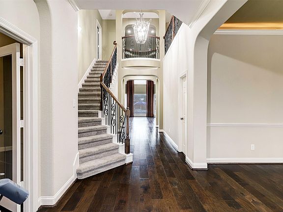 Gorgeous front entry invites you into this stunning home! Beautiful entry with hardwood floors, wrought iron stair case. French doors to a private office/study. Formal dining, butlers pantry that leads to an amazing kitchen! Kitchen has plenty of cabinets and with granite counter space. Open living with high ceilings, custom drapes, and stone fireplace. Primary suite with additional sitting area, en-suite bath with double walk in closet space. This backyard is relaxing and inviting, travertine coping, water features, spa and tanning ledge. Enjoy sitting under the patio watching tv, grilling and enjoying the outdoor fireplace. 3 car tandem. Spacious upstairs 2 bedrooms share a jack-n-jill bath, both have walk in closets, small office nook, and game room or media for your upstairs entertainment. Gleannloch amenities include golf, tennis, basketball courts, baseball fields, swimming pools, splash pads, sand volleyball, lakes, dedicated dog park & several parks, walking trails.