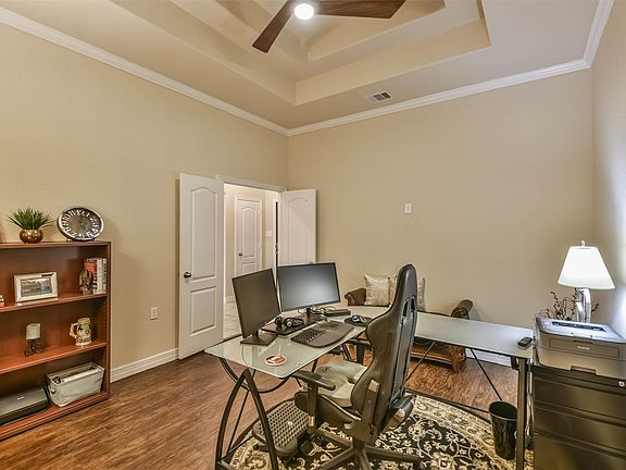 Hard-to-find 1-story with open floor plan and outstanding finishes in Stewarts Forest! Feel the warmth of home when you step through the front door. Impressive ceiling details in the entry and the study/media room are eye-catching as you enter. Tile and engineered wood flooring for easy care and maintenance. A noticeable theme is the abundance of windows, allowing great natural light in the main living areas and the primary bedroom. Extensive cabinetry with a dark finish, granite counters with incredible space plus stainless steel appliances create a sleek and sophisticated look to the kitchen and dining. The sunroom is a very special feature, surrounded by windows offering a beautiful view of the back yard and extended patio. Oversized 3-car garage, fantastic back yard, with amazing patio and outdoor living space, plus trees and garden area. RO system plus a whole house water softener. This home is a MUST SEE! Community walking trails, pool, and convenient location.