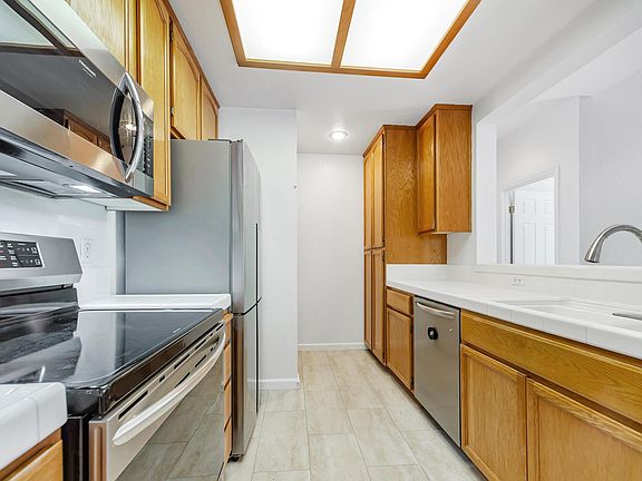 Light and high ceilings. Near bay front, walking paths, shopping & freeway access. 2 bedrooms, 2 bath. Newly updated kitchen has all new stainless appliances, induction stove & washer/dryer. Fresh updates include new tile in the bathrooms and fresh paint throughout. Ceiling fans in every room. Wonderful deck with extra storage. 1 car garage & community pool. Neighbors Nob Hill Foods, shopping center, Bay Club. Water, garbage, landscaping & sewage included. In unit washer/dryer. 12 month lease.