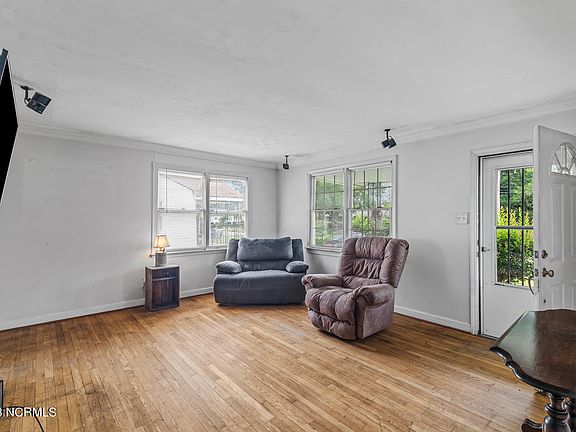 Welcome to this charming 3-bedroom, 2-bathroom home in a fantastic Trent Park location! The large covered front porch greets you and is an ideal space to enjoy your morning coffee or watch the sunsets. The home features real hardwood flooring through the living room and bedrooms and crown molding throughout. As you enter the kitchen and dining room through an arched opening, you will see the updated kitchen cabinets, offering rich warm tones. The large family room features new vinyl flooring, wood paneled walls, built in shelving, and a wood burning fireplace. The abundance of windows makes this room warm and bright! There is a full bathroom with wainscoting and a standup shower; and a laundry room conveniently located off the family room. Down the hallway the real hardwood floors continue to all three bedrooms with ceiling fans. Off the primary bedroom, you find an additional full bath with charming checkered flooring, large vanity and a tub shower combo with glass doors. The home has a large fenced in backyard (with an included chicken coop) in a well-established neighborhood. The front exterior landscaping was thoughtfully designed to add to the curb appeal of the home. It offers vibrant colors and a welcoming atmosphere. The detached 2 car garage offers additional storage or parking.