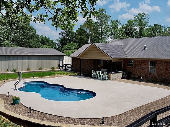 OPEN HOUSE FRIDAY 6/6/25 from 3:30 - 5:30....DO NOT MISS! Stunning 4BR/3BA all brick/ranch style home on 2+ acres w/inground fiberglass (heated) pool, attached 2 car garage PLUS 30' x 50' detached garage, PLUS 25' x 15' detached utility garage - has mini-split system for heating/cooling. FINISHED WALKOUT basement - 4th BR is in basement - does not have closet/room previously used as an office but could easily be 4th BR if needed. Covered back porch includes mini-outdoor kitchen w/grill and smoker included. MASSIVE spacious decking around the saltwater pool for entertaining guests. This place will be the spot everyone wants to hang out - backyard area/pool is also fenced in as well - property extends well beyond the fence. GUN/SAFE ROOM in basement - see pictures - this place just has it all. PLENTY OF PARKING FOR YOUR BOAT OR CAMPER TOO!!! Full list of amenities available on request....OH, and it's got a geothermal system too. Preapproval letter required with any offer and seller requires minimum of 24 hours to respond to an offer.