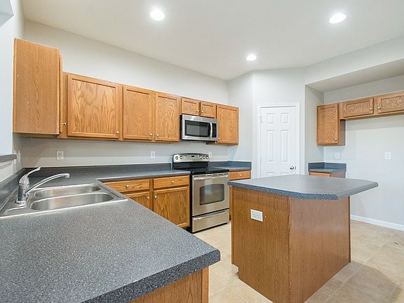 This Spring Hill Home offers a two-car garage, an open back patio, stainless steel appliances, a fireplace, gas heating, a kitchen island with a breakfast bar, a walk-in master closet and a master bathroom with a sitting vanity.