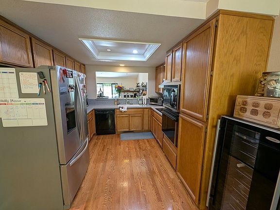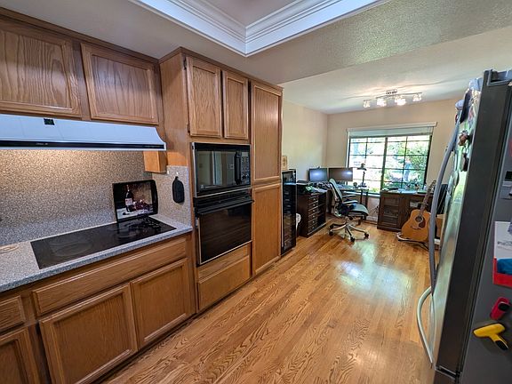 Step inside to an open, light-filled layout featuring cathedral ceilings, hardwood flooring, and a seamless indoor-outdoor flow with direct backyard access. The kitchen is fully equipped with appliances including a French-door refrigerator/freezer, electric cooktop, microwave, dishwasher, wall oven, and garbage disposal.