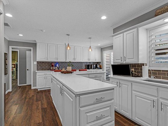Welcome to this beautifully updated home featuring a spacious primary suite, 3 additional bedrooms, 3.5 bathrooms, a dedicated office, and a finished basement. You will enter the home through a secluded front courtyard with a welcoming patio and covered porch. The oversized living room feels warm and welcoming with its vaulted ceilings, wood beams, and a wood-burning fireplace with gas starter. It has an oversized dining room that opens to the living room, making it easy to entertain and perfect for cozy nights in or gathering with the whole family. The isolated master suite has plenty of room with two large walk-in closets and a double-sink vanity. The other three bedrooms are well laid out with two bathrooms, one of which is a Jack and Jill. They also offer great storage, with two bedrooms featuring multiple closets and a third with a large walk-in closet. The remodeled kitchen features stunning quartz countertops, a subway tile backsplash, double ovens, a gas cooktop, and plantation shutters that let in plenty of natural light. With tons of cabinet space and an L-shaped island with a breakfast bar, it's perfect for both cooking and entertaining. The quiet, secluded office at the back of the home offers plenty of privacy and has numerous cabinets and shelves for added storage. If you don't have a need for an office, it could be used as a flex space such as a playroom, sewing room, game room, etc. The large laundry room has great storage and includes a half bath. You enter the finished basement with vinyl flooring and includes AC/heat and a storage closet. New roof and oversized gutters in 2024, HVAC system replaced 2018, new windows in 2020, painted in 2022, kitchen remodel 2019 and much more! Schedule an appointment to see this one today!