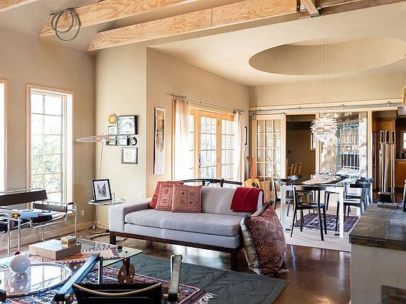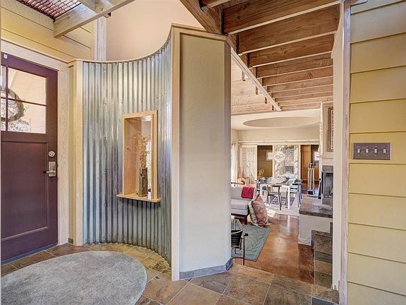 Look at this one-of-a-kind, original, and distinctive home designed by renowned architects. Every room is considered with regard to light, space, furniture placement, and circulation in this five-bedroom, three-bathroom home. Starting at the street entry, one enters a secluded courtyard and is faced with the tower entry feature. Once inside, natural materials and colors envelop your experience through the living and dining; the dining room has curated exterior living spaces on both the north and south sides. The large kitchen has a unique "tree" feature anchoring the experience. A vestibule between the two-car garage and kitchen is a perfect office/utility nook. Above the garage is a separately accessed carriage apartment with a fourth bedroom, adaptable for an office, mother-in-law suite, or short-term rental. On the opposite side of the house are three bedrooms, including a primary suite that overlooks the courtyard. Above the bedroom wing is a fifth bedroom/bonus room, suitable as a movie room, office, or flex space. Above the living room is a loft library open to below, with a walk-out deck overlooking the courtyard below. This home is meticulously cared for, plus new exterior paint and a new roof and storm shelter added in recent years- see the attached documents for a complete list of updates and detailed floor plan. Overall, an entirely unique experience awaits a new owner ready to embrace this home's natural beauty and design.