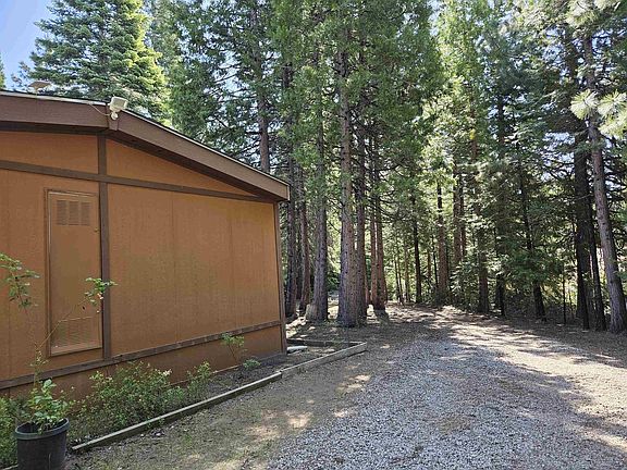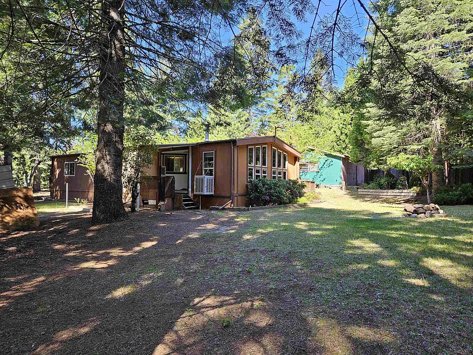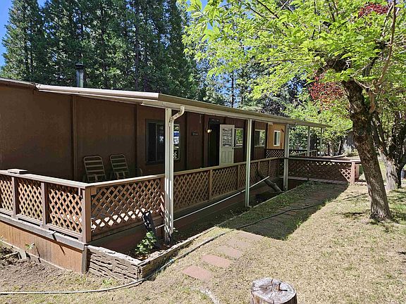 Hang out in the 80's or create a new look with trips to Home Depot. This is a livable home which needs some repair. There is a window unit air conditioner, unknown if it works. Monitor Heat and Wood Stove. Needs new floor coverings and a patch in the subfloor near the end of the kitchen counter into the dining area. Situated on a beautifully treed 1-acre parcel, this 1980 manufactured home has a well and is on the Mt Shasta City Sewer system. There is a "garage", so the building permit calls it, however, the opening is so low that unless it is a sports car, it is not driving into the "garage". The garage door is wood and very heavy and does not have springs. The building has loads of storage space. The roof on the garage/storage unit is in poor condition. One of the bedrooms was converted into an office space, located near the laundry room.