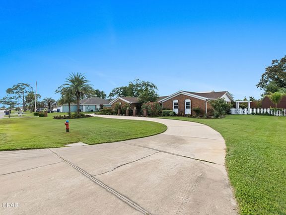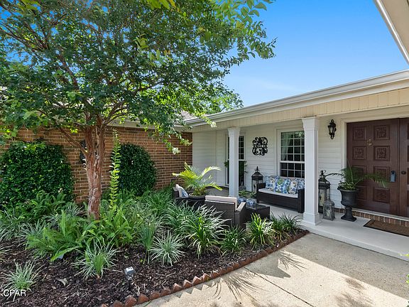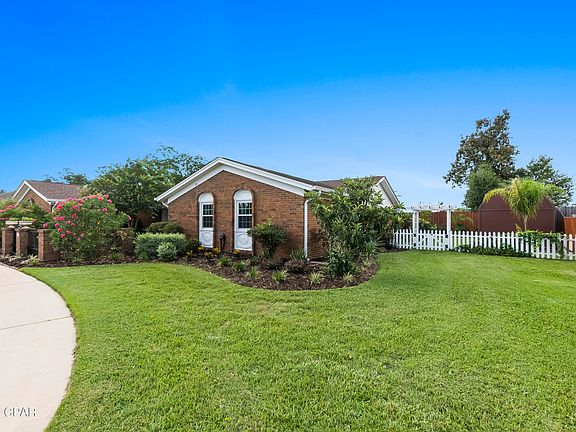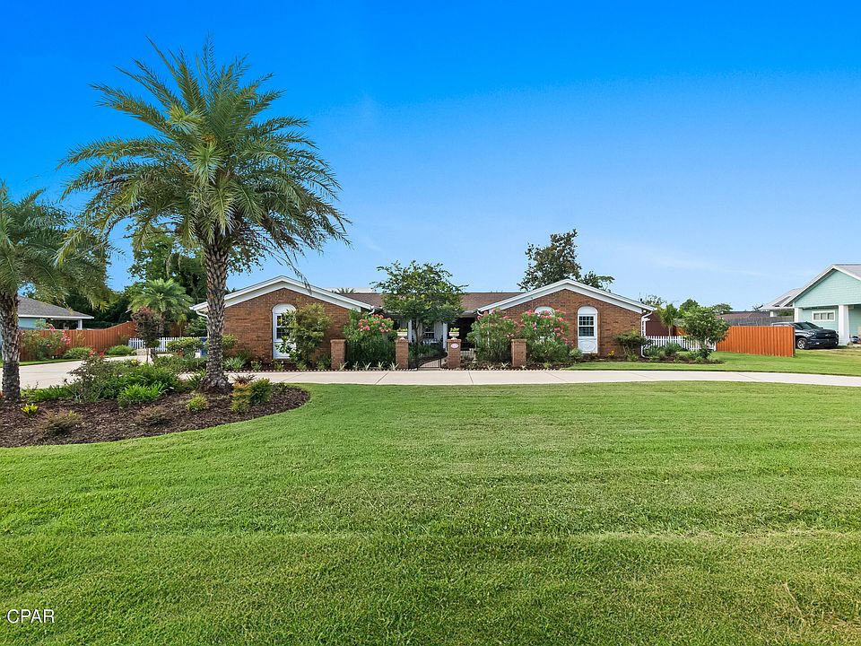 STUNNING 4 BEDROOM 2 BATH BRICK HOME SITUATED ON AN AMAZING LOT WITH LUSH LANDSCAPING, GARDENS AND SO MUCH MORE. As you enter the circular driveway you will immediately notice all the Southern charm this house presents with its wrought iron fencing and gate to the charming porch. Home offers a very open floor plan, crown moulding throughout, newer roof, new A/C 2020, all new windows, new hot water heater, a replaced central vacuum, formal living room, large family room complete with a dining area, and cozy wood burning fireplace, LVP flooring and French doors leading to the patio. The cook in the family will love the chef's kitchen with its white cabinets, granite counter tops, Frigidaire appliances, double oven, professional cooktop, wine/beer chiller, commercial microwave, two pantry's, large island, tile backsplash, an abundance of counter and cabinet space, pot filler, tile flooring throughout kitchen and laundry room. The kitchen will definitely be a focal point of this home for all your family gatherings. Sizeable master suite with a large walk in closet, jet tub and shower tiled bath and vanity, the additional bedrooms are a nice size as well. Sellers have maintained meticulous grounds you will immediately draw your attention to the custom patio pavilion with a large pergola, tv, fountain, blooming fruit trees, large storage building, pavers, 8 ft. privacy fence and to maintain this beautifully landscaped yard is a deep well for outdoor irrigations. Owners have paid close attention to every detail of this amazing home, you just don't see homes like this on the market often, call for your private showing today. Great location and just 10 minutes from the beach, 5 minutes to the bay and a public boat ramp, shopping, restaurants, hospital and wonderful schools. All ages, sizes including sq. ft. is approximate, measure if important.