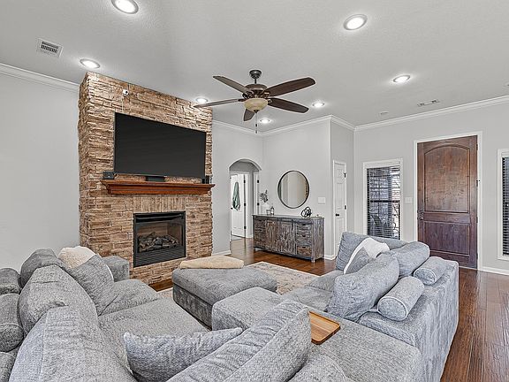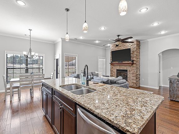 Welcome home to 2004 Walnut Valley Drive! The meticulously landscaped lawn and inviting curb appeal make a memorable first impression. Step inside to discover a spacious open floor plan with soaring 10-foot ceilings and an abundance of natural light. The living room showcases a stunning floor-to-ceiling stone gas log fireplace, perfect for cozy evenings. The home features hardwood, laminate, and tiled floors throughout for a clean and modern look. The thoughtfully designed split floor plan offers privacy for the expansive master suite, complete with a walk-in closet, a luxurious jetted tub, and a tiled walk-in shower. The kitchen is a chef’s dream, featuring rich dark cabinetry, granite countertops, and stainless-steel appliances, including a new microwave and dishwasher installed in 2024. Enjoy outdoor living on the pergola-covered patio that overlooks a picturesque landscape, providing the perfect space for relaxing or entertaining. The roof was just replaced in 2022. This home is the perfect blend of timeless elegance and modern convenience—schedule your showing today to experience its beauty firsthand!