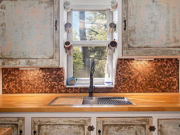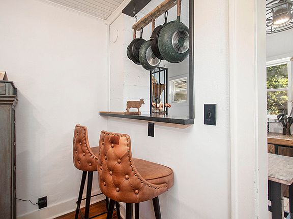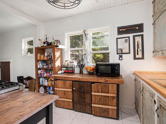 Charming 2 bedroom home on nearly 2 acres! This home offers a unique style blending original charm with updated finishes. Open concept living and dining area boast refinished original hardwood flooring. The kitchen combines original distressed cabinetry with a butcher block countertop and penny backsplash. It has a pass-through to the dining room and access to the basement and attached garage. Primary bedroom has an extra deep closet and both bedrooms offer refinished hardwood flooring. Updated bathroom with modern tile floors and new vanity. Enclosed front porch/3 seasons room and full basement add to the amenities of this home. The back yard is a hidden paradise offering paths to a firepit and a wooded backdrop. Don't miss your chance to call this your new home! Buyer to verify all info rmation. GC zoning could require conventional loans only.