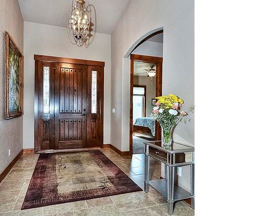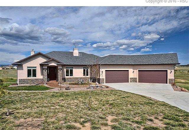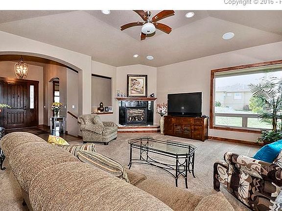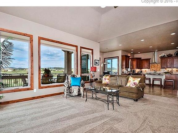When the owner was looking for a lot in Kings Deer, he wanted two things -- a lot that backed to the golf course and a view of Pikes Peak. Once he found the lot, he built this beautiful custom home with 5 bedrooms, 6 baths and an oversized 4-car garage. In front of the home one starts to notice the quality in this home with a stamped concrete walkway that goes all the way to the front door. Upon entering, buyers will note the porcelain tile that goes through the entry, down the halls, through the dinette, kitchen and into the laundry room. The great room has a gas fireplace and many large windows framing the panoramic views. The adjacent gourmet kitchen includes granite counters, double oven and a very large center island with multiple uses. The inviting master suite has a gas fireplace, a walk-out to the deck, large closet and 5-piece master bath. All main level doors are 8 feet. The main level has two bedrooms but if more space is needed, the basement is very spacious and includes a gas fireplace, family room, walk-out, three bedrooms, 3 bathrooms, pool table area and a popular upgrade request of a built-in large bar. Basement ceiling height is 9' 8". Easy access to the freeway for traveling to Colorado Springs or Denver.