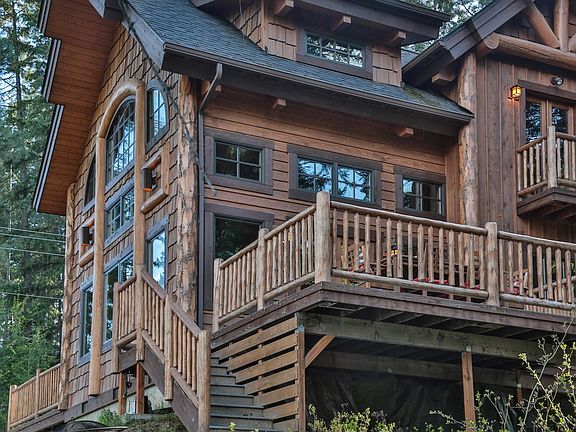 Private & intimate timber frame home overlooking the Wenatchee River. Refined rustic finishes, Douglas Fir post and beam, vertical grain Fir doors complement a 25 ft. vaulted great room with floor to ceiling flagstone fireplace. Spacious loft ready to accommodate overflow guests. This home's handsome exterior marries massive hand hewn logs, stone pillars, slate and hardwood decking with warm cedar shakes and siding. Begin or end your days on the inviting sun deck with sunken Hot Springs therapeutic spa. A beautiful, detached garage has been finished with complimentary finish work by Timberwood Custom Homes for additional living quarters above the large garage. 2 pine studded acres provide privacy, a lovely seasonal creek and ample room for future outbuildings...