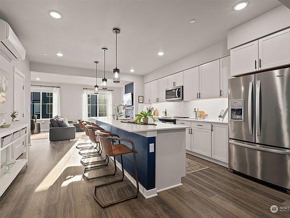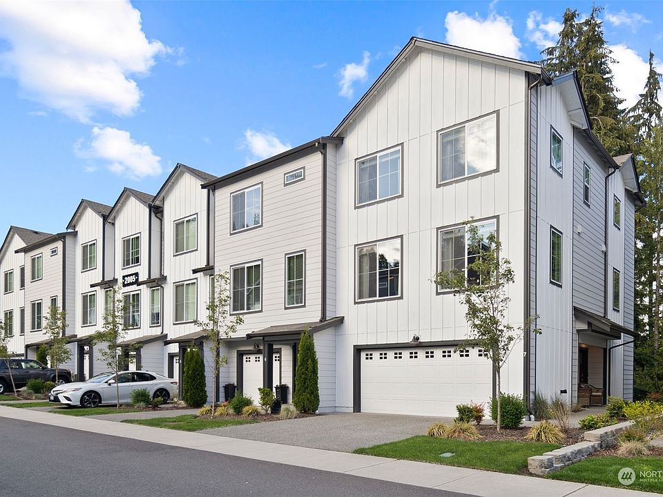 Discover a stunning 4-bedroom, 3.5-bathroom modern townhome designed with luxury and comfort in mind. Featuring upgraded lighting, stylish vinyl plank flooring, SMART technology, and a cozy electric fireplace. Enjoy soaring 9-foot ceilings and a custom workspace. This end unit offers privacy backed by a serene greenbelt. The gourmet kitchen boasts elegant cabinetry, quartz countertops, under-cabinet lighting, a massive island, walk-in pantry, and stainless steel appliances. Community amenities include a dog park, fire pit, playground, and scenic trails. Just minutes from the lake, Costco, and downtown Snohomish. Welcome home!