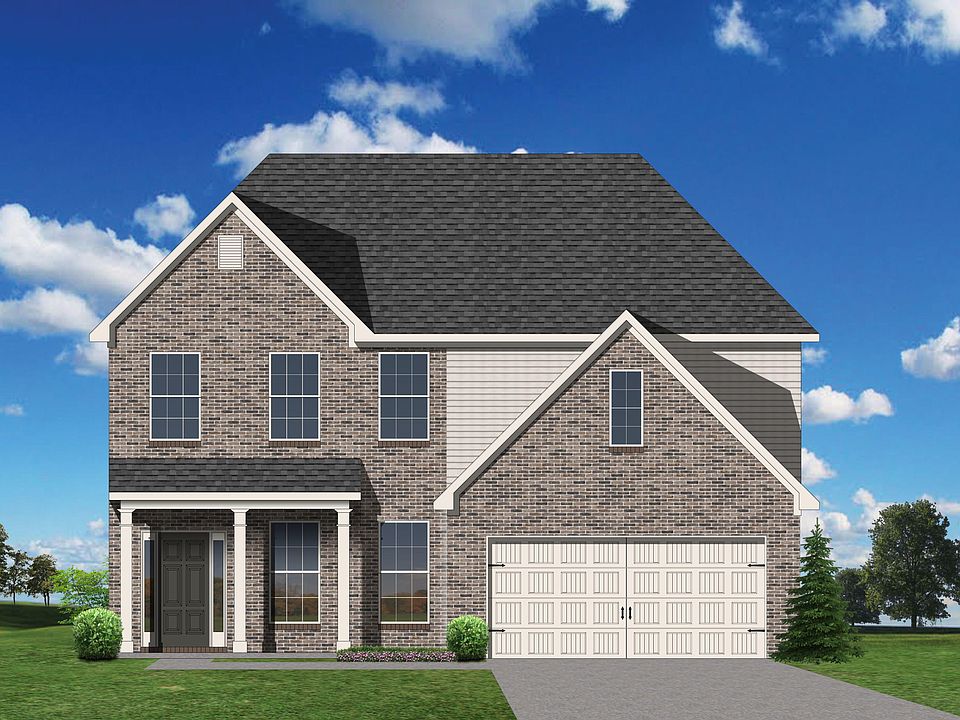 The Torrington II. A spacious traditional two-story home offering an open layout with a large family room and a flex area that can serve as formal dining, living, or a study. The kitchen includes both an island dining counter and separate breakfast area. The garage opens to a utility room, powder room, and pantry adjacent to the kitchen and located off a private hallway. The master suite, three additional bedrooms, hall bath, and a loft comprise the second floor. The master suite includes a vaulted ceiling in the bedroom and a private bath with spacious double bowl vanity.
