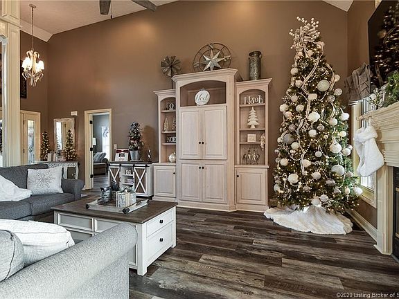 JAWDROPPER! This Floyd Knobs beauty is situated on nearly an ACRE and boast soaring ceiling height in the great room with awesome farmhouse Luxury vinyl plank on entire main floor, WOODBURNING fireplace, FORMAL dining room, Foyer, and a great kitchen with a full compliment of appliances, breakfast bar, and eat in kitchen overlooking the gorgeous lot! This is a split bedroom floor plan and the LUXURIOUS and LARGE master suite is gorgeous boasting a double tray ceiling, recessed lighting, sitting area, private bath with corner tub, shower, dual sinks, and walk in closet! The lower level WALKOUT basement and is nearly ALL finished with NEW paint, dry bar great for entertaining, big family room, full bathroom, common area great for playing cards, and a 4th bedroom! The rear of the house will take your breath away, offering a GIGANTIC vaulted covered deck with tongue and groove ceiling, recessed lighting, fans, and below is a large patio area with a custom wood burning fireplace that is incredible! Recent updates include; Paint, LVP flooring, HVAC, widened driveway, landscaping, remodel master bath, STORAGE shed with custom shelving, water heater and Roof in 17', and more! Call today!