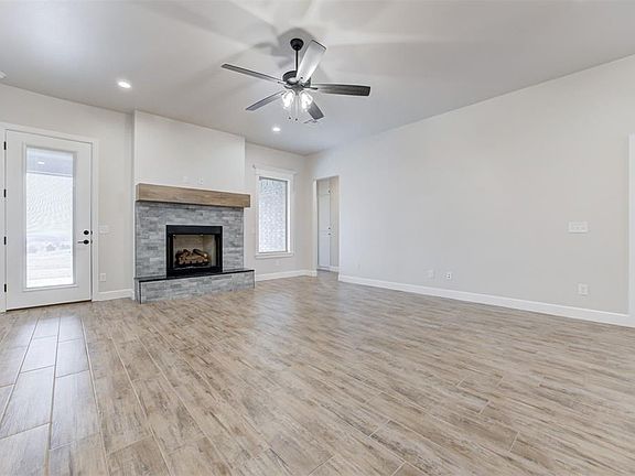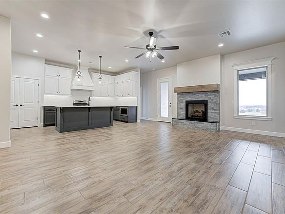 Welcome to this stunning 4-bedroom, 2.5-bathroom, 3 car garage house located in the Grey’s Harbor Addition in Blanchard. Situated on a spacious 1.04-acre corner lot, this house offers both privacy and room to roam. As you step inside, you'll immediately notice the charm and warmth of this home. The tile fireplace surround with a wood-stained mantle creates a cozy ambiance in the living area. The kitchen boasts quartz countertops, subway tile backsplash, double oven, and stylish white cabinets on top with grey cabinets below. The master bedroom is generously sized and features an ensuite bathroom complete with double vanities, a jetted tub, and a large walk-in shower with rain head. The master closet is thoughtfully designed with built-in dressers and shoe racks, providing ample storage space. Half bath off the living/kitchen area ensures comfort for your guests. The laundry room includes a mud bench, counter space, and storage cabinets, making laundry chores a breeze. Step outside to the oversized covered back patio where you can relax and enjoy the serene surroundings. The mature trees on the property add to the peaceful atmosphere.