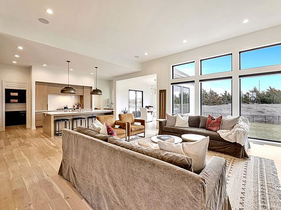 Welcome to an oasis of sophistication in the sought-after community of Sweetgrass! With its painted brick exterior, clean lines, perfect shade of white walls, refined finishes, and tall ceilings, this home exudes timeless elegance and charm at every turn. Nestled on a 0.57 acre East-facing lot, the exquisite 1-1/2 story Avondale floor plan by Nies Homes offers a seamless blend of style and functionality. An abundance of windows spanning the back of the home soak the living spaces with natural sunlight, creating a warm and inviting atmosphere throughout. The heart of this home is a stunning great room featuring 12' ceilings, a dramatic wall of windows, and a gorgeous fireplace flanked by built-ins and picture lights. Every cook will appreciate the gourmet kitchen, where culinary creations come to life with a large center island/eating bar, designer pendant lighting, double ovens, a built-in side by side refrigerator/freezer, a gas range, fabulous walk-in pantry, display cabinets with glass doors, and crisp white quartz countertops and backsplash. The oversized dining space is perfect for casual dining or entertaining guests with windows on two sides and a door to the covered patio on a third wall. Indulge in the luxurious primary suite, featuring a raised ceiling, spa-like ensuite bath, oversized tile shower, expansive vanity, private toilet closet, large walk-in closet with a center divider/built-ins, and a convenient laundry room connected to the closet. Across the main level, a pocket office with a desk leads to a second main floor en-suite bedroom. A dedicated drop zone and powder room finish the main level. Upstairs, you'll find a bonus bedroom, complete with an en-suite bath and walk-in closet, providing flexible living options to suit your needs. Entertaining is effortless in a fully finished basement complete with a large family room, recreation area large enough for your favorite game table, stylish wet bar with a dishwasher and beverage cooler, two additional bedrooms at opposite ends of the home, two full bathrooms, and a versatile bonus room with endless possibilities. The four-car garage includes a rarely found door for package delivery, ensuring peace of mind and convenience for busy homeowners. Extend your living space outdoors on a covered patio that provides the ideal spot for outdoor dining or lounging. A large, fenced backyard that basks in the gentle morning sun, providing the perfect setting for your morning coffee or evening gatherings, offers plenty of space for recreation. Better than new and only a few years old, this showstopper has been thoughtfully designed and meticulously maintained, presenting a fantastic opportunity to own a true gem in Wichita, within the Andover School District. Schedule your private showing today; don't miss!