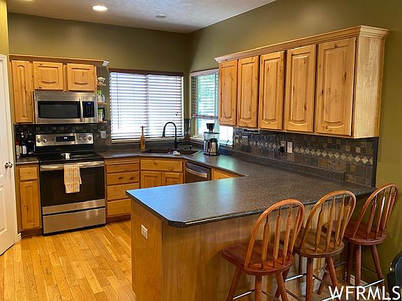 Nice 2 story with curb appeal. 9' vaulted ceilings, amazing master suite with sitting area and mountain view. Fully finished basement, 2 water heaters, RV parking, creek behind property. Huge patio and 2 storage shed. Bedroom main floor (office/craft room, etc has no closet).